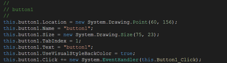 실제로 컨트롤의 이벤트를 생성한 다음 *.Designer.cs 파일을 열어보게 되면 아래와 같이 버튼의 생성 코드 부분에서 각 이벤트 처리기에 생성된 메서드가 등록되는 것을 확인할 수 있다.