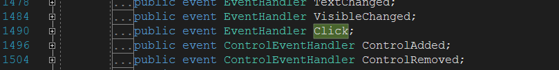 이렇게 Control 클래스에 public event EventHandler Click이라고 정의되어 있는 것을 확인할 수 있다. (event 키워드는 신경 쓰지 말자. 지금은 delegate에 대해서만 설명한다.)