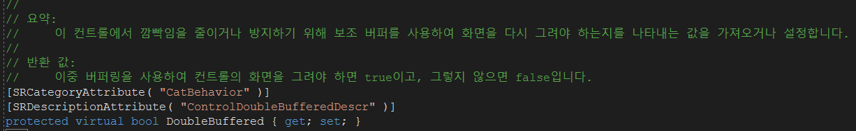이러한 현상을 해결하기 Control 클래스에는 위해 컨트롤의 이중 버퍼링을 활성화하여 깜빡임을 최소화하는 DoubleBuffered 속성이 존재하는데, 이 속성은 protected로 선언되어 있기 때문에 Control 클래스를 상속받아 생성되는 컨트롤에서 DoubleBuffered 속성에 접근하기 위한 별도의 방법을 public으로 제공하지 않는다면 속성 창을 통해서, 또는 참조 변수를 통해 접근할 수 없다.