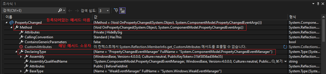 실제로 디버그 모드로 실행 후 PropertyChanged 이벤트를 조사해보면 우리가 등록한 적 없는 메서드가 등록되어 있는 것을 확인할 수 있는데, 이것이 PropertyChangedEventManager의 OnPropertyChanged 메서드이다.