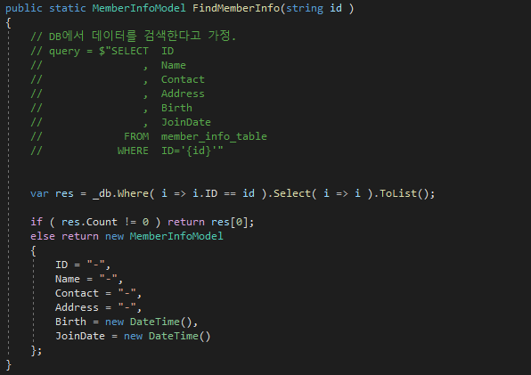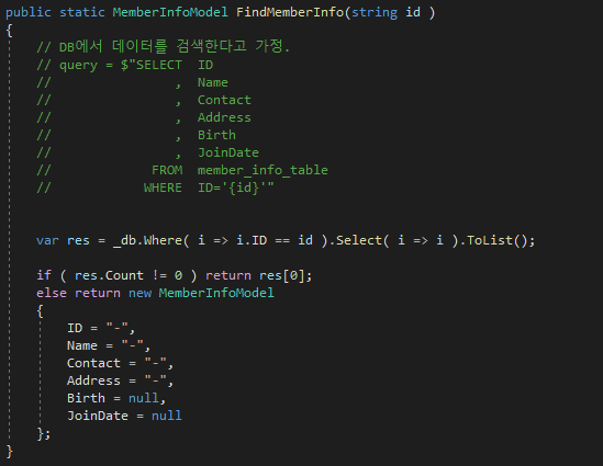 기존에 res.Count가 0인 경우에는 null을 반환했지만 이제는 새로운 MemberInfoModel을 만들고 각 필드를 초기화하여 반환하도록 변경했다.