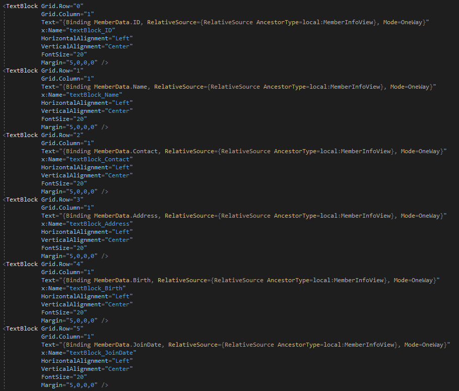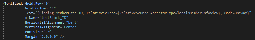 코드를 작성하는 단계에서 바로 뒤에 나올 RelativeSource~ 부분이 아직 작성되지 않았다면 당연히 MemberData.ID를 입력하는 과정에서 자동완성이 되지 않으니 당황하지 말자.
