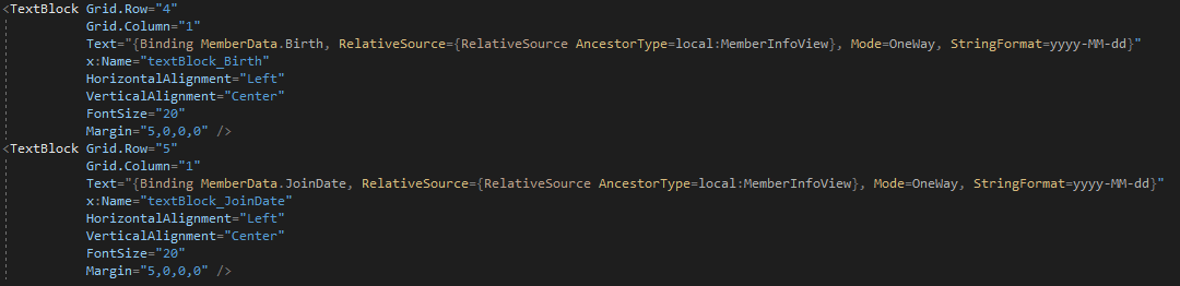 다음으로 XAML 코드에서 읽기 전용으로 바인딩하기 위한 Birth_Str와 JoinDate_Str 속성을 추가했다. 이 두 속성은 각각 Birth와 JoinDate가 null인지 검사하고 null이라면 "-"를, null이 아니라면 ToString("yyyy-MM-dd")의 결과를 반환한다.
