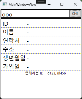 다만 이러한 경우 검색된 ID가 존재하지 않을 때 각 필드의 값을 하이픈(-)으로 표시하는 기능은 동작하지 않는다. 기존 코드에서는 PropertyChangedCallBack 메서드에서 이러한 내용을 처리했기 때문에 검색된 ID가 존재하지 않는 경우를 의미하는 MemberData가 null인지를 검사하여 대체 행동을 취할 수 있었지만 순수 XAML에서는 이러한 조건부 행동을 구현하기 어렵다.
