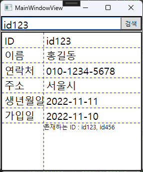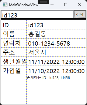 다만 이러한 경우 검색된 ID가 존재하지 않을 때 각 필드의 값을 하이픈(-)으로 표시하는 기능은 동작하지 않는다. 기존 코드에서는 PropertyChangedCallBack 메서드에서 이러한 내용을 처리했기 때문에 검색된 ID가 존재하지 않는 경우를 의미하는 MemberData가 null인지를 검사하여 대체 행동을 취할 수 있었지만 순수 XAML에서는 이러한 조건부 행동을 구현하기 어렵다.