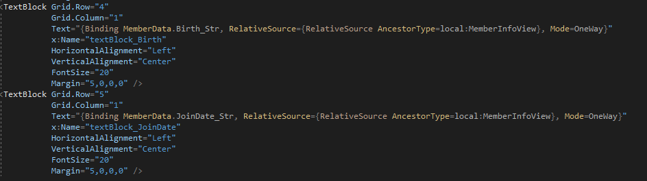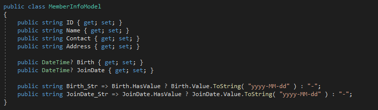다음으로 XAML 코드에서 읽기 전용으로 바인딩하기 위한 Birth_Str와 JoinDate_Str 속성을 추가했다. 이 두 속성은 각각 Birth와 JoinDate가 null인지 검사하고 null이라면 "-"를, null이 아니라면 ToString("yyyy-MM-dd")의 결과를 반환한다.