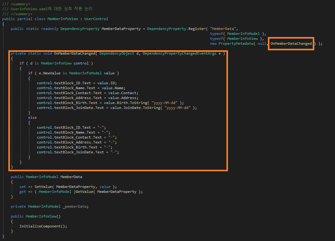 바인딩을 하기 위해 PropertyMetadata에 PropertyChangedCallBack 메서드를 사용하여 사용자 정의 속성값이 변경되었을 때 각 컨트롤에 변경된 값들을 직접 지정해줬음을 기억할 것이다.