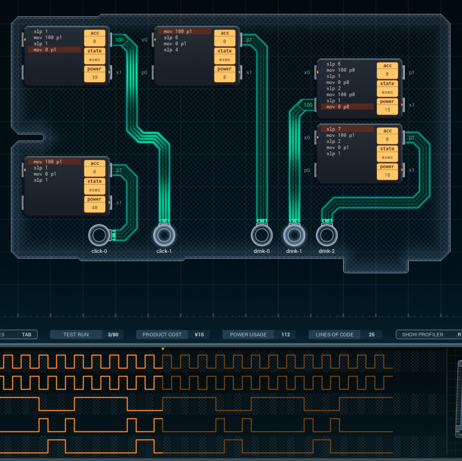 click-0과 click-1은 not 명령 (acc 레지스터의 값을 0 <-> 100 전환한다.)을 이용해 단순하게 구성하고,